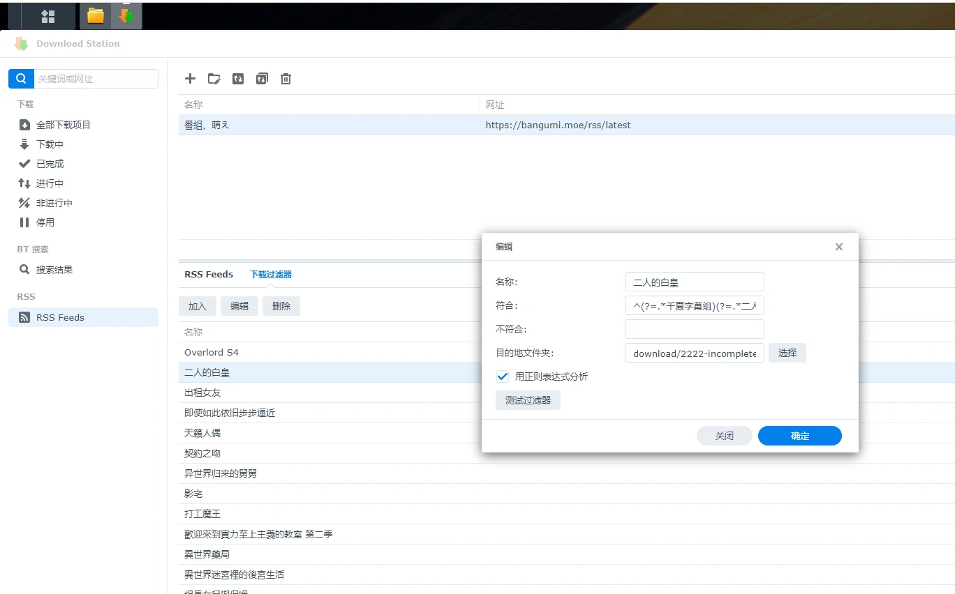 登录管理员账户更改群晖Download Station的rss刷新间隔为30分钟, (可选, 可以使用群晖普通账户)创建rss订阅同时设置每个番剧的下载过滤器