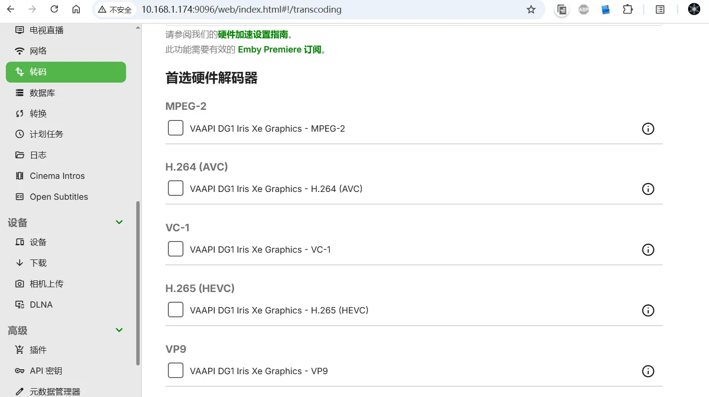 plex和emby的容器镜像目前都不支持dg1显卡的识别与编解码,因为镜像内置的qsv驱动与vaapi驱动太旧了。