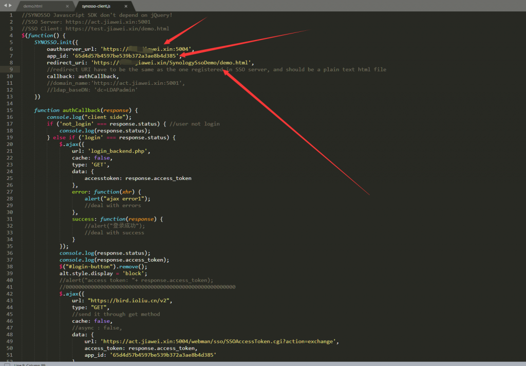 在js中需要修改认证服务器地址(oauthserver_url),app_id,回调地址(redirect_uri)。app_id需要和SSO服务器中的设置保持一致。如图