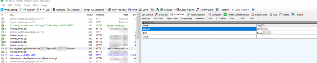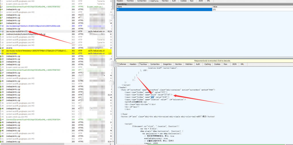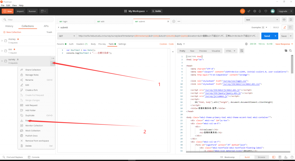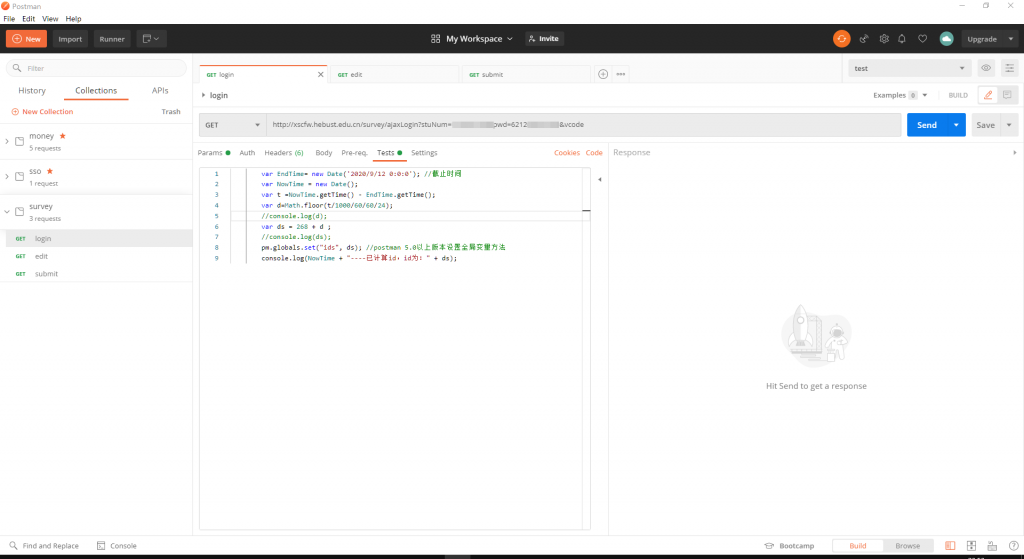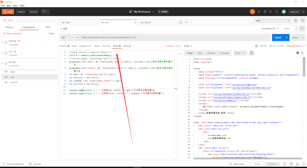 第二步,带着cookies进入http://xscfw.hebust.edu.cn/survey/surveyEdit?id={{id}},使用cheerio获取网页中的Stuid和qid。同样是在tests里写js。