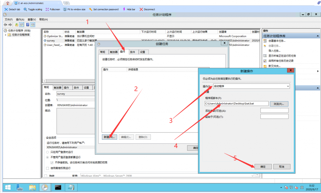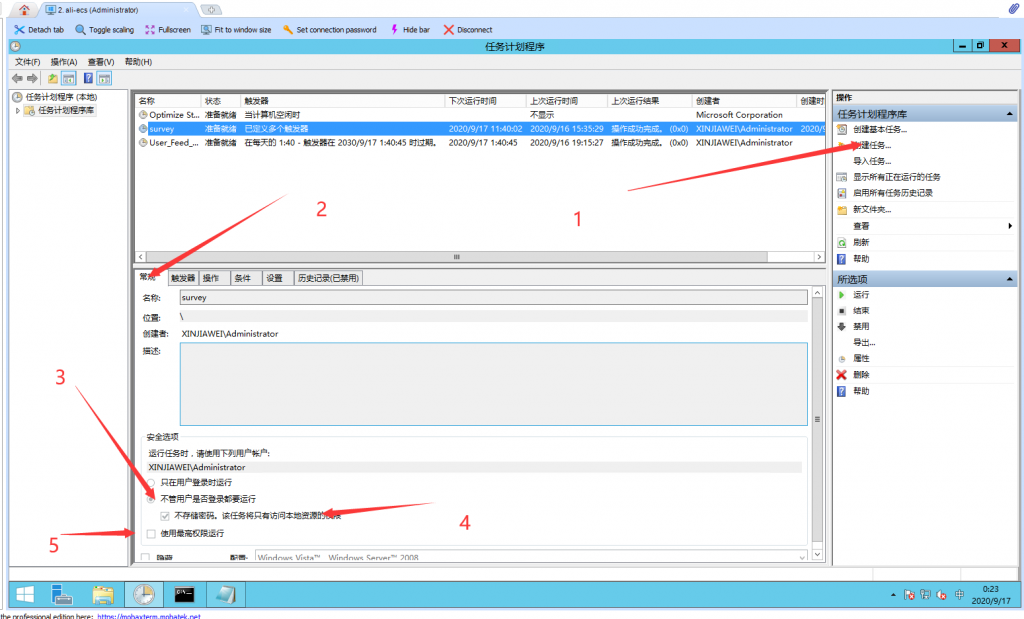 然后在找到服务器的“任务计划程序”,按如下顺序设置