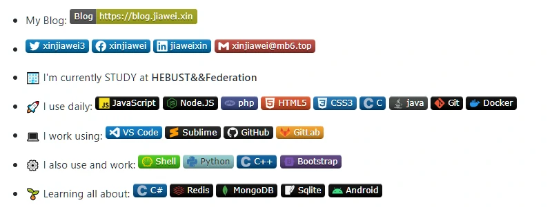 //markdown的写法,第一个参数是title("Blog"是title),第二个参数是message("https%3A%2F%2Fblog.jiawei.xin"),第三个是背景色("yellowgreen"),第四个是点击跳转的网页("https://blog.jiawei.xin")。